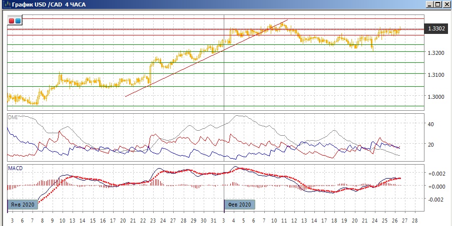 На дневном графике пара тестирует "круглый" уровень 1,3300. То, что пара закрепилась выше 1,3270, в краткосрочно скорее в сторону дальнейшего роста - сильное сопротивление на 1,3350, но для этого необходимо закрытие выше 1,3300. Однако на 1,3350, кроме сильного уровня сопротивления, скорее образуется медвежье расхождение максимумов пары и гистограммы MACD. Это будет осложнять рост и затруднит преодоление сопротивления на 1,3350. По индикаторам направленного движения сохраняется коррекция к росту: DM+ остаётся выше DM-, ADX на очень высоком уровне, коррекция видна по нахождению гистограммы MACD в отрицательной зоне, отрицательному наклону линии MACD.