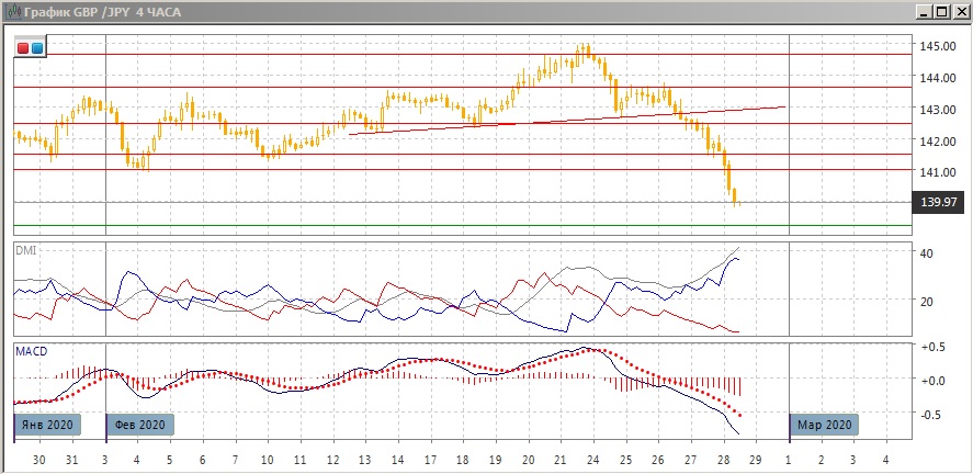 На четырёхчасовом графике снижение очень сильное, оно проходит после подтверждения модели голова-плечи 13-26 февраля. Размер снижения уже превысил цель. Важная поддержка на 141,00 была преодолена сходу. Скорее, это говорит о том, что ослабления тенденции сейчас нет, и скорее снижение будет продолжаться. По индикаторам направленного движения снижение очень сильное: DM- значительно выше DM+ при высоком и растущем уровне ADX, гистограмма MACD снижается в отрицательной зоне, линия MACD имеет отрицательный наклон.