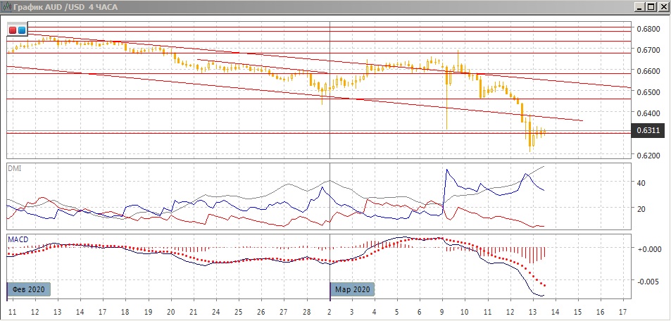 На дневном графике пара преодолела нижнюю границу нисходящего канала с января. Такое сильное снижение как 12 марта, когда образовалась огромная широкодиапазонная свеча, имеет высокие шансы продолжиться. По индикаторам направленного движения тенденция снижения очень сильная: DM- значительно выше DM+, ADX на очень высоком уровне и рост продолжается. Гистограмма MACD снова в отрицательной зоне, линия MACD имеет отрицательный наклон. Образование новых минимумов продолжается. Отчасти снижение облегчается тем, что пара на долговременном минимуме, и вблизи нет привычных уровней поддержки, кроме "круглых". Размер снижения, равный широкодиапазонной свече, указывает на психологически важный уровень 0,60.