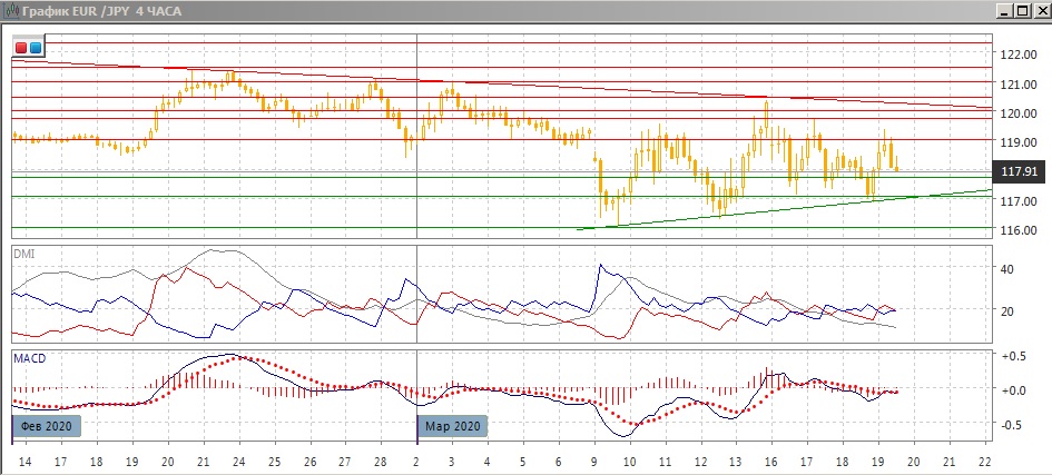 На четырёхчасовом графике пара вновь снижается от уровня 119, который был поддержкой в феврале - начале марта и сопротивлением в марте - в марте это уже четвёртое снижение, его можно также рассматривать как снижение после приближения к уровню 119,75. Сходя из движения в диапазоне, целью может нижняя граница на 117,00. Это будет примерно соответствовать краткосрочной восходящей линии тренда с 9 марта. По индикаторам направленного движения в этом масштабе флэт: DM+ и DM- пересекаются, ADX на низком уровне, гистограмма MACD колеблется около нуля, линия MACD примерно горизонтальна.