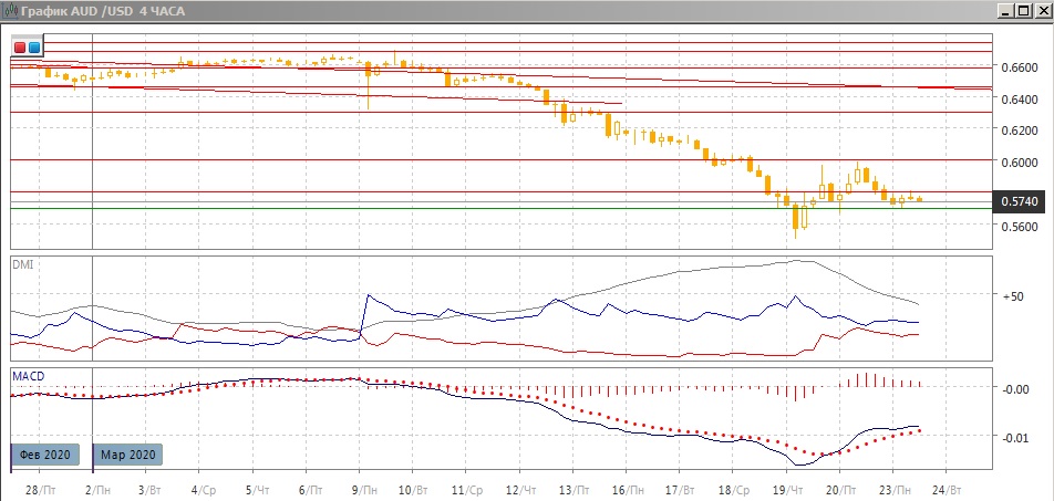 На четырёхчасовом графике отскок, который произошёл 19 марта, развития не получил - уже тогда пара приблизилась к психологически важному уровню 0,6000. Относительный максимум ниже него 20 марта образовал двойную вершину. То, что рост замедляется, видно по гистограмме MACD - она снижается. Если пара останется в узкой консолидации, в рамках движения в диапазоне 0,57-0,60 более вероятно движение к верхней границе. Однако приостановка движения вверх в понедельник повышает вероятность относительно быстрого выхода из диапазона вниз.