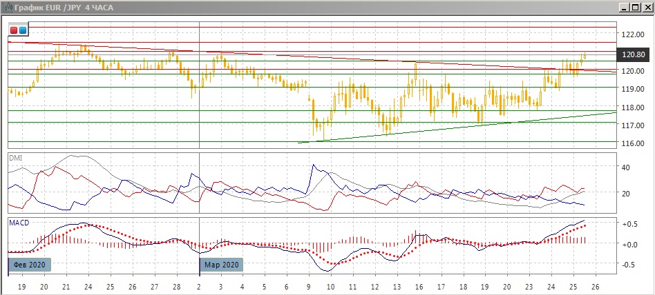 На четырёхчасовом графике пара вышла из треугольника вверх, преодолев уровень 119,75. После консолидации выше в границах 119,75-120,45 пара, возможно, продолжает рост. Это является более вероятным, так как консолидация в узком диапазоне была выше преодолённого уровня сопротивления. Рост относительных максимумов и минимумов пары продолжается. По индикаторам направленного движения тенденцией стал рост: DM+ уже устойчиво выше DM-, уровень ADX вырос, гистограмма MACD в положительной зоне, линия MACD имеет положительный наклон. Пока пара выше 119,75, рост кажется предпочтительным в краткосрочной перспективе.
