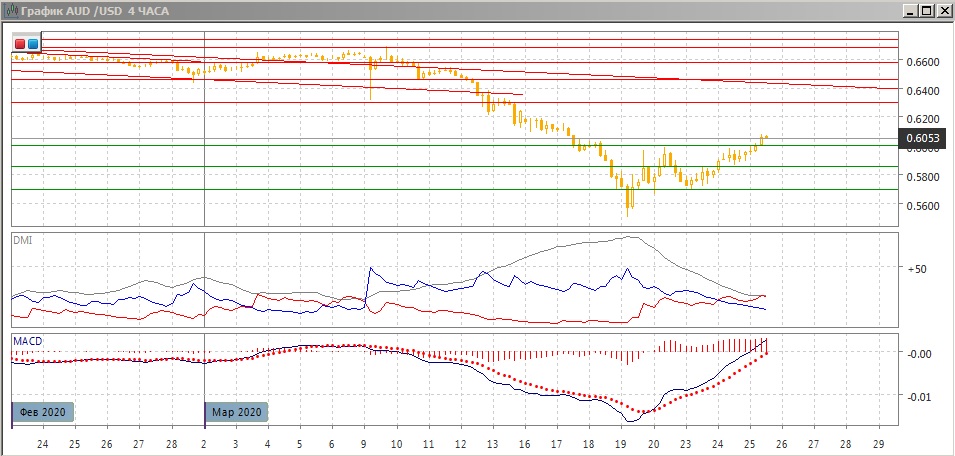 На четырёхчасовом графике пара выходит из диапазона 0,57-0,60 вверх. Если пара закрепится выше, по исходя из размера диапазона, цель измеренного движения может быть 0,63. Это соответствует уровню сопротивления у минимума резкого падения 9 марта и поддержке-сопротивлению 12-13 марта. По индикаторам направленного движения тенденцией стал рост: превышение DM+ над DM- увеличивается, гистограмма MACD в положительной зоне, линия MACD имеет положительный наклон. Пока пара выше 0,6000, продолжение роста кажется предпочтительным. Возвращение ниже 0,6000 изменило бы картину на образование ложного пробоя уровня 0,6000.
