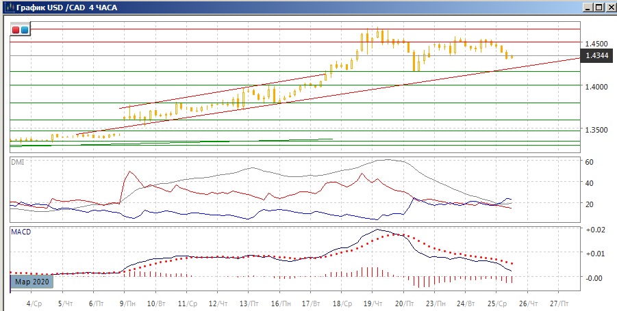 На четырёхчасовом графике обозначилось сильное сопротивление на 1,4500, линия восходящего тренда не преодолена и пара остаётся существенно выше уровня резкого восстановления 20 марта на 1,4155. Это создаёт некоторый баланс и пара может в краткосрочной перспективе оставаться примерно на текущих уровнях.