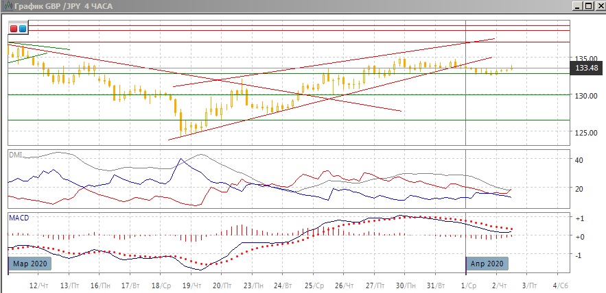 На четырёхчасовом графике пара вновь тестировала уровень 132,75. Учитывая снижение ниже линии тренда, отскок от уровня кажется менее вероятным, чем его преодоление. При стабилизации диапазоном для консолидации может стать 132,75-135, у максимумов 30 и 31 марта. Преодоление уровня 132,75 открыло бы дорогу к следующей поддержке на 130,00.
