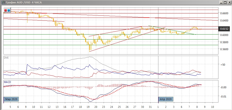 На четырёхчасовом графике уже образовалась вершина у 0,6220. Это укрепляет сопротивлением там, и делает снижение до ближайшей сильной поддержки на психологически важном уровне 0,6000 более вероятным. Снижение предпочтительно и если рассматривать горизонтальный канал с 27 марта. Закрепление выше 0,6220 изменило бы картину.