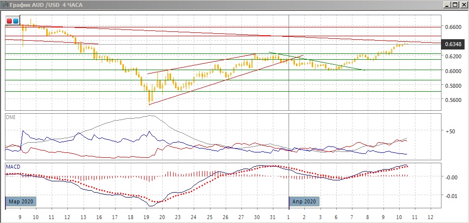 На дневном графике пара выросла до линии тренда с конца декабря. Это важный уровень сопротивления, он усиливается находящимся рядом минимумом конца февраля. По индикаторам направленного движения пара может перейти к росту: более краткосрочные индикаторы уже показывают рост: гистограмма MACD растёт в положительной зоне, линия MACD имеет положительный наклон, превышения DM- над DM+ уже нет и возможно пересечение. Дальнейшее движение скорее будет зависеть от того, преодолеет ли пара линию тренда: если да, открывается пространство для роста вплоть до 0,6680 (поддержка в феврале и сопротивление в начале марта). Исходя из цели измеренного движения (равенство волн роста с середины марта и с начала апреля) целью может быть 0,67.