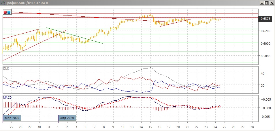 На четырёхчасовом графике образовался относительный максимум у 0,6400. Если рассматривать движение в канале 0,6220-0,6400, снижение после тестирования верхней границы кажется предпочтительным. С другой стороны, отсутствие этого возвращения увеличивает вероятность выхода из канала вниз. По индикаторам направленного движения флэт: DM+ и DM- близки, ADX на низком уровне гистограмма MACD около нуля, наклон линии MACD небольшой.