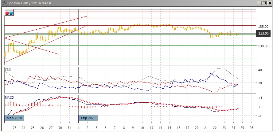 На четырёхчасовом графике пара колеблется у уровня поддержки 132,75. Большое число близких к "дожи" свечей показывает, что ситуация неопределённая. Возвращение пары выше 135,75 после снижения 21 апреля делает этот снижение возможным ложным пробоем, и увеличивает вероятность возвращения пары к верхней границе канала на 135,00. В другой стороны, отсутствие роста после этого ложного пробоя скорее медвежий признак - сигнал не сработал. Сейчас, вероятно, лучше подождать и действовать в направлении выхода от 132,75.