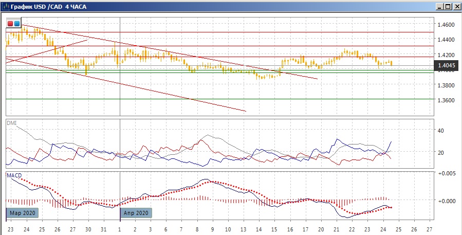 На четырёхчасовом графике пара перешла к снижению. Относительные максимумы и минимумы пары последовательно снижаются с 21 апреля. Также можно увидеть и модель "голова-плечи", в этом случае линией шеи будет уровень 1,4000. Как и в более крупном масштабе, перспектива, вероятно, будет определятся тем, устоит ли поддержка на 1,4000, так как это сильный уровень. Тестироваться он, вероятно, будет. Но рассчитывать на дальнейшее снижение до того, как он будет фактически преодолён, преждевременно.