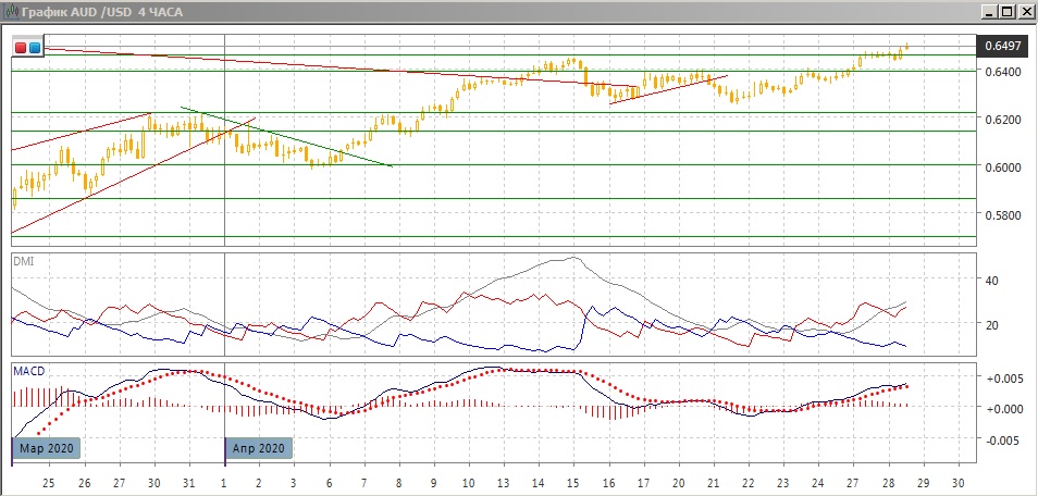 На четырёхчасовом графике продолжается последовательный рост от 0,6220. По индикаторам направленного движения тенденция роста становится сильной: превышение DM+ над DM- большое, ADX на высоком уровне и растёт, линия MACD имеет положительный наклон, однако по снижению гистограммы MACD видно замедление роста с 27 апреля. Пара преодолела уровень 0,76460 после тестирования 27-28 апреля. Пока пара выше, продолжение роста видится предпочтительным. Риск отката повышается за счёт того, что "круглый" уровень 0,6500 достигнут. Но в целом, ситуация сейчас благоприятная для австралийского доллара как получающего выгоду от общей склонности к риску на рынке.