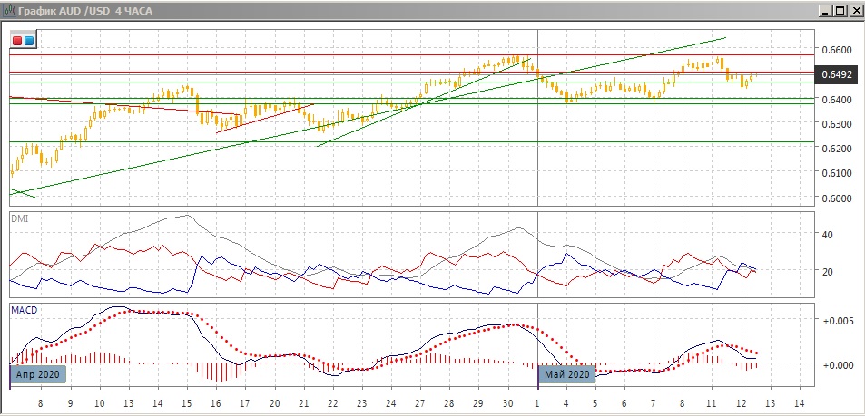 На четырёхчасовом графике пара после снижения от сопротивления на 0,6570 получила поддержку на уровне 0,6460 (там было сопротивление в конце апреля и начале мая). Однако важно то, что пара преодолела психологически важный уровень 0,6500, и сейчас он выступает уже сопротивлением для пары. В краткосрочной перспективе, вероятно, пара будет двигаться в сторону выхода от текущих поддержки на 0,6460 (тогда следующей целью видятся минимумы мая на 0,6375) и сопротивления на 0,6500 (тогда пара может вернуться сопротивлению на 0,6570).