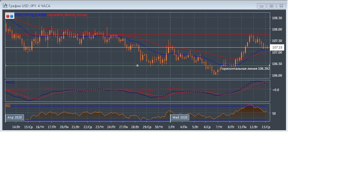 Скользящие средние с периодом 21 и 55 дней развернулись вверх и растут, увеличивая расхождение, что говорит о бычьем потенциале данного рынка в краткосрочной перспективе. Четырёхчасовой график прогрессирует чуть выше экспоненциальных скользящих средних, что так же подтверждает бычий потенциал данного рынка в краткосрочной перспективе.