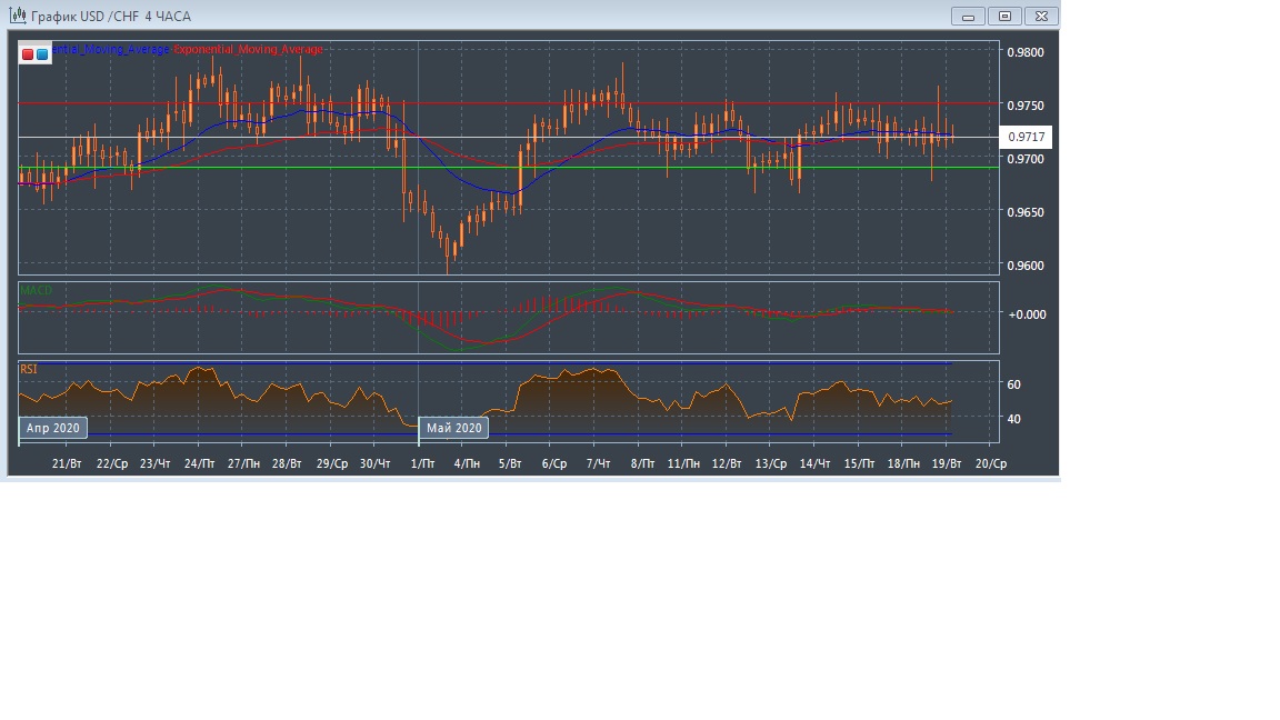 На четырёхчасовом графике скользящие средние с периодом 21 и 55 дней замедлились и сокращают расхождение. При этом график рынка развивается между экспоненциальных скользящих средних, что говорит о нейтральном потенциале данного рынка в краткосрочной перспективе.
