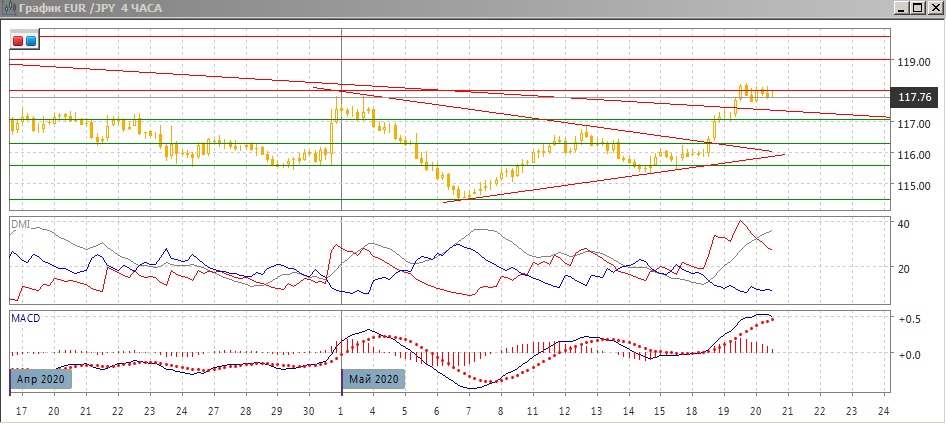 На дневном графике пара ситуация изменилась: пара выше линии нисходящего тренда с января, также нарушена последовательность снижения относительных максимумов с конца марта. Сейчас относительные максимумы и минимумы уже растут. Пара, однако, пока не закрепилась выше линии нисходящего тренда. Восстановление выше сильного сопротивления на 116,30 (на минимумах марта) скорее бычий знак. Снижение ниже 115,60 в начале мая выглядит теперь ложным пробоем, что делает вероятным более существенный рост. По индикаторам направленного движения тенденцией стал рост: DM+ теперь выше DM-, гистограмма MACD растёт в положительной зоне, линия MACD имеет положительный наклон. Фактором против разворота являются верхние тени свечей ниже уровня сопротивления 118,00 (у максимума конца апреля). Для продолжения роста, вероятно, необходимо закрепление выше линии тренда и уровня 117,00.
