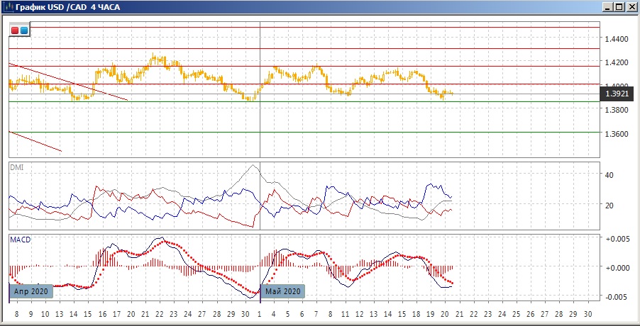 На дневном графике пара снизилась к нижней границе диапазона 1,3850-1,4300. Пока это не меняет картины, и в рамках движения в более узком диапазоне 1,3850-1,4155 более вероятен рост к верхней границе. Негативным для пары может являться скорость снижения: 7 и 18 мая пара, по сути, снизилась к нижней границе диапазона за одну свечу. Это делает выход вниз немного более предпочтительным. По индикаторам направленного движения сохраняется флэт: DM+ и DM- пересекаются, ADX на низком уровне, гистограмма MACD на нуле, линия MACD почти горизонтальна.