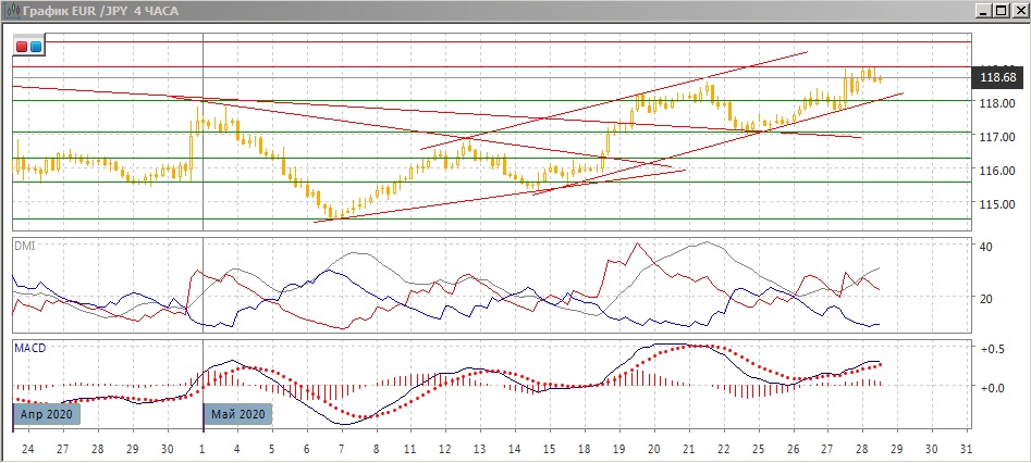 На четырёхчасовом графике рост замедлился, что видно по отсутствию подтверждения новых максимумов по MACD, но тенденция сохраняется. Пара выше краткосрочной линии тренда с 14 мая. По ADX в этом масштабе тенденция роста сильная: превышение DM+ над DM- большое при относительно высоком уровне ADX. Уровень 119,00, скорее, вновь будет тестироваться. Рост в краткосрочной перспективе остаётся предпочтительным пока пара выше восходящего тренда и находящегося близко к нему уровня 118,00.