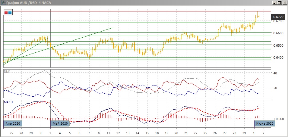 На четырёхчасовом графике, возможно, волна роста выдыхается: образовалась хорошо выраженная "падающая звезда", если она будет подтверждена, стоит ожидать отката. Поддержкой может быть ранее преодолённый уровень на 0,6680. В этом даже откат не меняет сильной тенденции роста в данном масштабе. По ADX также тенденция роста хорошо выражена: превышение DM+ над DM- большое и устойчивое, по ADX на относительно высоком уровне.