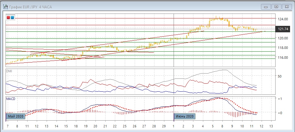 На четырёхчасовом графике образовался ещё один относительный минимум около 121,20. Как и на в дневном графике, этот уровень важен, так как может стать линией шеи для разворотной модели - с одним плечом 3-4 июня и вторым 9-10 июня. Восстановление выше 122,55, возможно, отменило бы образование модели, а снижение ниже 121,20 - подтвердило (это совпало бы с другим сигналом для снижения в виде преодоления линии восходящего тренда). По индикаторам направленного движения в этом масштабе ситуация примерно нейтральная: DM- и DM+ близки, рост гистограммы MACD около нулевого уровня компенсируется отрицательным наклоном линии MACD.