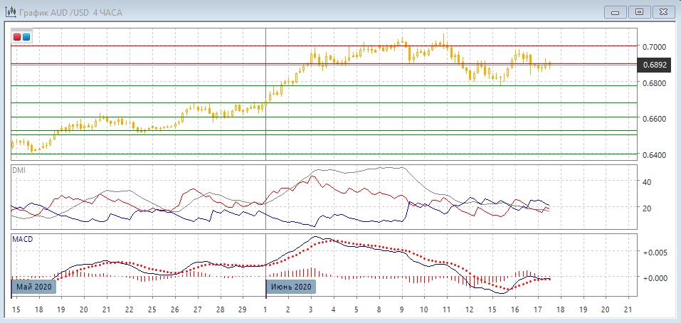 На четырёхчасовом графике ситуация примерно нейтральная: в одной стороны, образовалась большая вершина рядом с 0,70. С другой стороны, 12 и 15 июня образовалось двойное дно и пара сумела преодолеть сопротивление на "круглом" уровне 0,6900, чего при доминирующей тенденции снижения не стоило бы ожидать. После возвращения ниже 0,6900 16-17 июня, пара не возобновила снижение. Последовательности по относительным минимумами и максимумам нет. Консолидация может продолжиться с границах 0,68-0,70. По индикаторам направленного движения в этом масштабе флэт: DM+ и DM- близки, ADX на относительно низком уровне, гистограмма MACD около нуля.