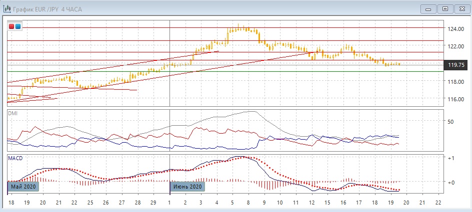 На четырёхчасовом графике после преодоления уровня поддержки на 120,30 пара консолидируется ниже уровня 120. Это соответствует преодолению уровня и дальнейшему движению. По ADX в этом масштабе тенденция снижения усилилась: превышение DM- над DM+ уже существенное. Исходя из размера диапазона 11-17 июня, целью снижения может быть уровень 118,60. Это примерно соответствует следующему уровню поддержки на 119,00.