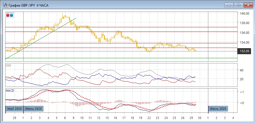На четырёхчасовом графике пара вышла вниз из узкого диапазона 132,75-133,65 вниз, 29 июня уровень нижней границы выступит уже сопротивлением. Предпочтительным является продолжение снижения, хотя уровень 132,00 является сильной поддержкой. По индикаторам направленного движения тенденцией стало снижение: DM- выше DM+, гистограмма MACD находится в отрицательной зоне, линия MACD имеет отрицательный наклон.
