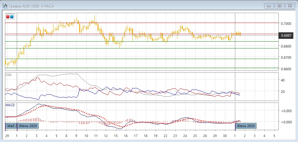 На четырёхчасовом графике продолжается движение в диапазоне 0,6775-0,7000. Пара с 25 июня остаётся ниже 0,6900, кратковременное преодоление уровня 1 июня может быть ложным пробоем, так как пара уже вернулась ниже уровня 0,6900. В этом случае более вероятно возвращение к минимумам 16-30 июня около 0,6835. По индикаторам направленного движения в сохраняется флэт: DM+ и DM- пересекаются, ADX на низком уровне, гистограмма MACD колеблется около нуля.