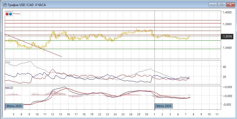 На дневном графике пара осталась в диапазоне 1,3500-1,3675. После ложного прорыва верхней границы в конце июня пара нижней, где, кажется, получила поддержку. В рамках движения в диапазоне предпочтителен рост к верхней границе на 1,3675. Закрытие ниже 1,3500 изменило бы картину. Пока кажется, что боковое движение будет продолжаться: несмотря на выход важных новостей, пара всё равно оставалась почти месяц в канале. По индикаторам направленного движения сохраняется флэт: DM+ и DM- близки, ADX на очень низком уровне, гистограмма MACD около нуля.