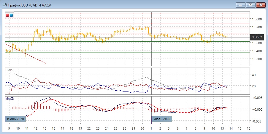 На четырёхчасовом графике пара также в диапазоне 1,3500-1,3675, более узкий диапазон в июле - 1,3500-1,3600. Снижение пары от 1,3600 уже началось, тени свечей выше 1,3600 показывают, что выход от текущего узкого диапазона не поддерживается. Целью движения в диапазоне является нижняя граница на 1,3500. По индикаторам направленного движения скорее остаётся флэт: DM+ и DM- пересекаются, гистограмма MACD колеблется около нуля, линия MACD сейчас примерно горизонтальна.