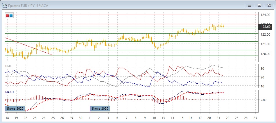 На четырёхчасовом графике 20 и 21 июля пара ограничивается уровнем 123,00. Выход из текущей узкой консолидации 122,55-123,00 скорее будет вверх, так как происходит консолидация в выше более широкого диапазона. По ADX в этом масштабе тенденция роста остаётся сильной: превышение DM+ над DM- большое, ADX на высоком уровне. Медвежьим фактором является образование медвежьего расхождения максимумов пары и гистограммы MACD, что увеличивает вероятность отката. Подтверждением сигнала может быть возвращение ниже 122,55. Однако немного ранее, 20 июля, образование медвежьего расхождения и снижение ниже ближайшего уровня поддержки не получили развития. Из этого можно сделать вывод, что разворот сейчас не поддерживается, и продолжение роста более вероятно.