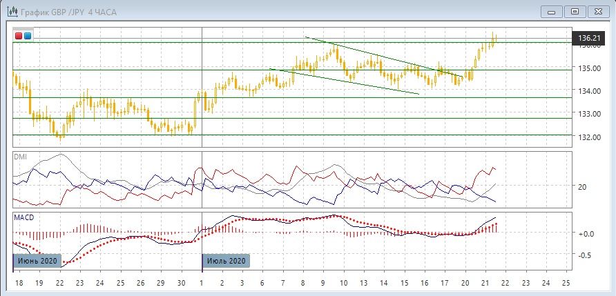 На четырёхчасовом графике пара преодолела предыдущий максимум июля у 136,00, этот уровень уже выступает поддержкой для пары, и пока пара выше этого уровня, можно ожидать продолжения роста. По индикаторам направленного движения рост стал сильной тенденцией: DM+ значительно выше DM-, уровень ADX вырос, гистограмма MACD растёт в положительной зоне, линия MACD получила положительный наклон.