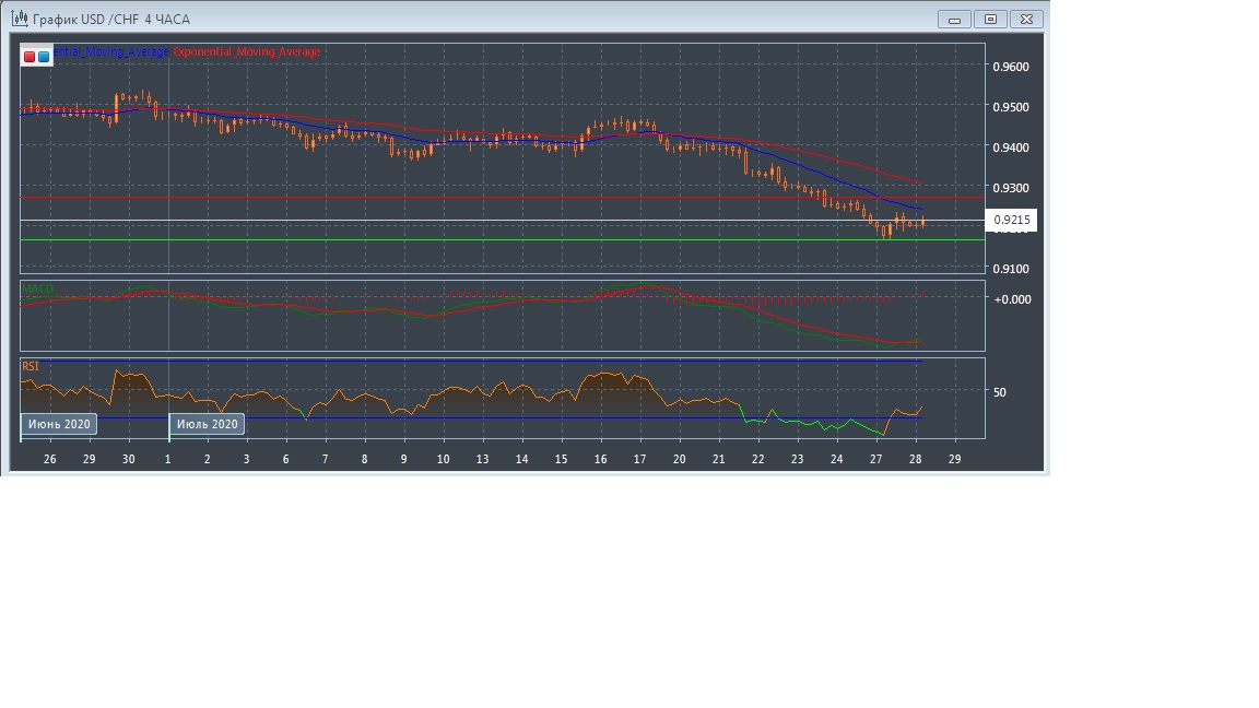 На четырёхчасовом графике скользящие средние с периодом 21 и 55 дней ускорились и развернулись вниз, увеличивая расхождение. При этом график рынка развивается ниже экспоненциальных скользящих средних, что подтверждает медвежью тенденцию данного рынка в краткосрочной перспективе.