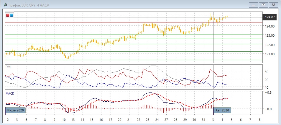 На четырёхчасовом графике пара получила при откате поддержку на уровне 124,35 (ранее сопротивление), при этом минимум 3 августа был около следующего уровня поддержки на 124,00. Пара приближается к максимумам 31 июля, и здесь сопротивление будет укрепляться из-за образования медвежьего расхождения максимумов пары и гистограммы MACD. Так как такое же расхождение есть и на дневном графике, вероятность отката от 125,00 увеличивается. Однако в целом, пока пара выше зоны 124-124,35, возобновление роста кажется предпочтительным. Исходя из размера предыдущего диапазона 123-124,35, целью измеренного движения может быть уровень 125,70.