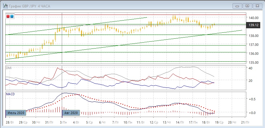 На дневном графике пара снизилась от уровня 140,00, он примерно соответствовал максимум июня. Снижение произошло после образования нескольких свечей "падающая звезда", и от верхней границы восходящего канала, если строить его с конца июня. Если рассматривать движение в канале, предпочтительным видится снижение к нижней границе. Однако в более широкой перспективе тенденция роста сохраняется: относительные минимумы пары растут, пара выше линии тренда, по ADX тенденция роста остаётся сильной (превышение DM+ над DM- большое, ADX на высоком уровне), хотя и замедляется (это видно по снижению гистограммы MACD и уменьшению положительного наклона линии MACD).