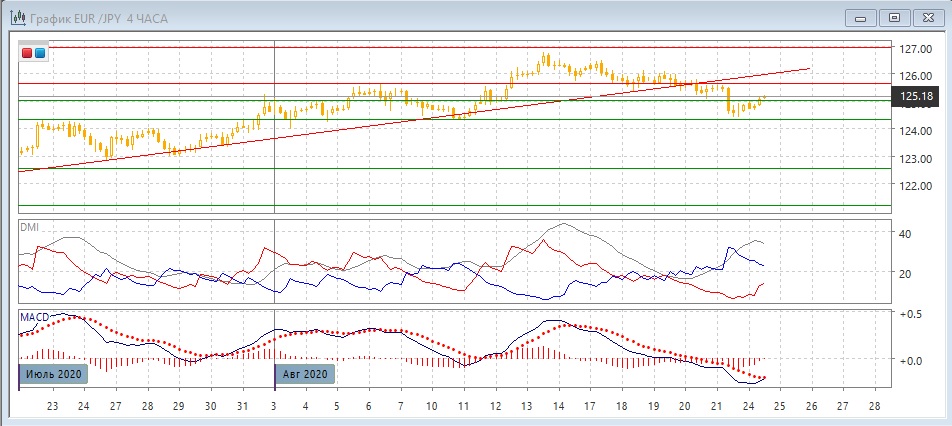 На четырёхчасовом графике последовательно снижение с 13 августа продолжается. Текущий отскок вверх от 124,35 можно рассматривать как коррекцию, и пара, скорее, вновь будет тестировать этот уровень. По индикаторам направленного движения в этом масштабе тенденцией стало снижение: превышение DM- над DM+ значительное при высоком уровне ADX. Коррекция видна по росту гистограммы MACD, которая остаётся в отрицательной зоне.