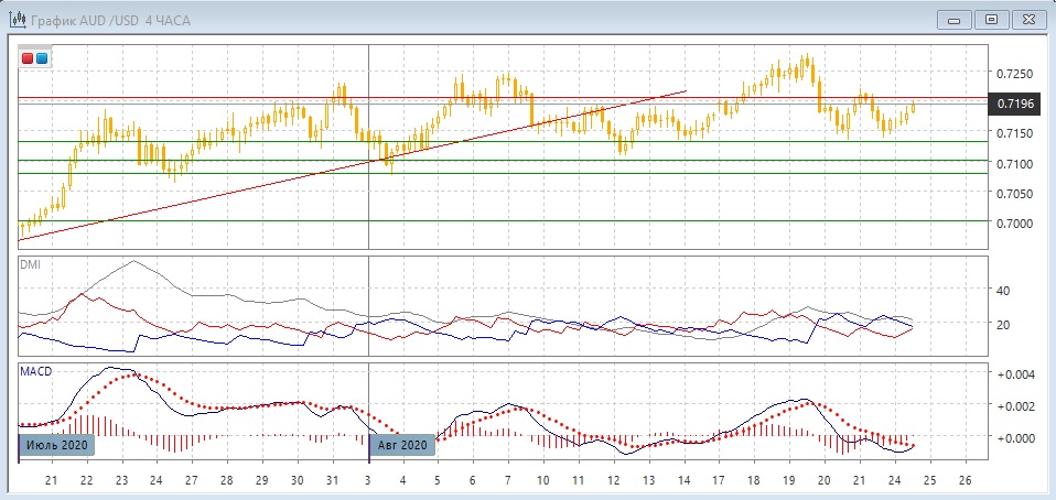На четырёхчасовом графике пара остаётся в диапазоне, на 0,7130 образовалось небольшое двойное дно. Сопротивление у 0,7200 как у круглого уровня и верхней границы канала укрепляется тем, что немного выше находится последний относительный максимум. По индикаторам направленного движения флэт: DM- и DM+ близки, гистограмма MACD восстановилась, но линия MACD сохраняет отрицательный наклон. Хотя в целом сохранение диапазона кажется более вероятным, отсутствие достижения нижней границы после ложного пробоя вверх и возвращение пары к верхней границе канала является бычьим знаком.