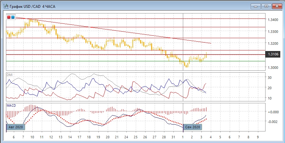 На четырёхчасовом графике произошёл разворот к росту: пара преодолевает "круглый" уровень 1,3100, последовательность снижения относительны максимумов и минимумов пары нарушена, и теперь они растут с начала сентября. По индикаторам направленного движения тенденцией стал рост: DM+ выше DM-, гистограмма MACD растёт в положительной зоне, линия MACD имеет положительный наклон. Однако пара приблизилась к сильному сопротивлению на 1,3140, здесь можно ожидать приостановки роста. Дальнейшее движение будет скорее всего в направлении выхода пары либо выше 1,3140 (возвращение в прежний канал) или ниже 1,3100 (снижение ниже "круглого" уровня с образованием картины ложного пробоя).