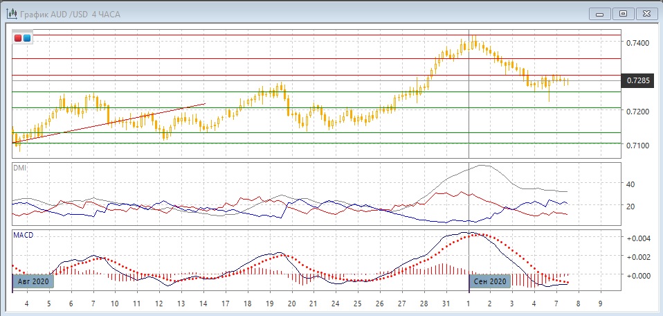 На четырёхчасовом графике после снижения происходит консолидация в относительно узком диапазоне 0,7250-0,7300. С результате прокола нижнего уровня образовался хорошо выраженный "молот" 4 сентября. Сопротивление на 0,7300 также проявилось в пятницу, и так как пара в целом чувствительна к "круглым" уровням, краткосрочного она может остаться в диапазоне в ближайшей перспективе, так как выхода важных данных, которые могли бы подтолкнуть пару в выходу из консолидации, не ожидается. По индикаторам направленного движения коррекция к снижению: DM- остаётся выше DM+, но гистограмма MACD растёт в отрицательной зоне.