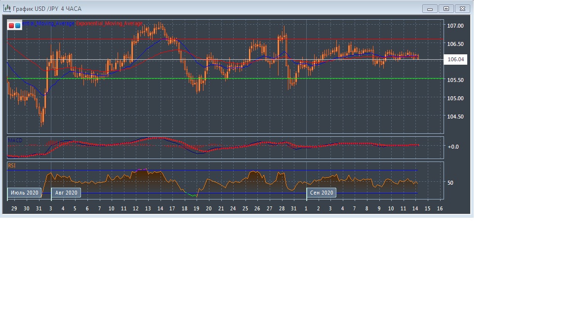 Скользящие средние с периодом 21 и 55 дней замедлились и двигаются вдоль своей оси сохраняя слабое расхождение, что свидетельствует в пользу нейтрального сценария данного рынка в краткосрочной перспективе. Четырёхчасовой график прогрессирует в области вдоль экспоненциальных скользящих средних и это подтверждает нейтральный потенциал данного рынка в краткосрочной перспективе.