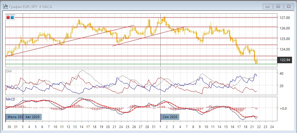 На четырёхчасовом графике пара Снижение является сильной тенденцией, учитывая сильный выход вниз после консолидации между 123,30 и 124,35, скорее движение в краткосрочной перспективе будет продолжаться. По ADX тенденция снижения сильная: превышение DM- над DM+ очень большое, ADX на высоком уровне. Несмотря на образование бычьего расхождения минимумов пары и гистограммы MACD, подтверждения этого сигнала не было. Отсутствие вблизи обоснованной поддержки облегчает снижение.