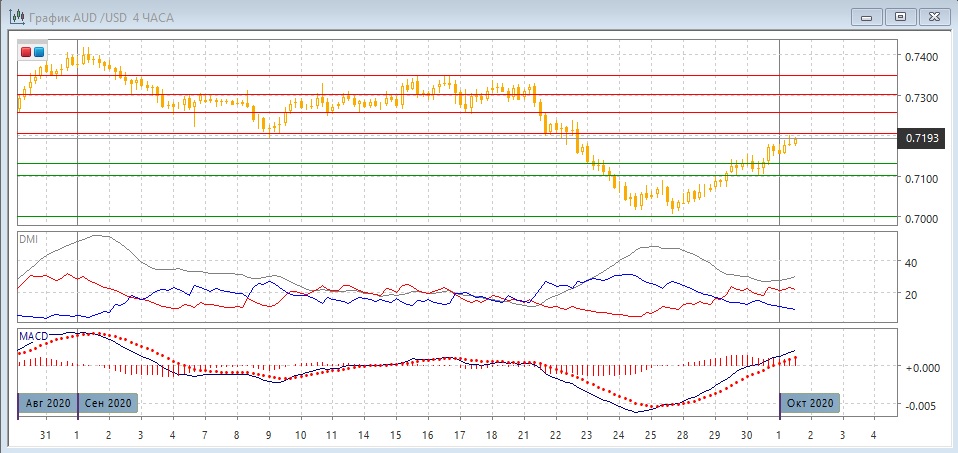 На дневном графике пара достигла важного уровня сопротивления на 0,7200 (оно проявлялось в июле и августе, там же находится минимум начала сентября). Дальнейшее движение, вероятно, будет зависеть от того, будет ли преодолён этот уровень: если да, это сделало бы возможной целью максимумы сентября у 0,7350. Если пара останется ниже 0,7200, сохранится картина коррекции к снижению. По индикаторам направленного движения - коррекция к снижению: DM- выше DM+, гистограмма MACD растёт, но остаётся в отрицательной зоне, линия MACD имеет отрицательный наклон.