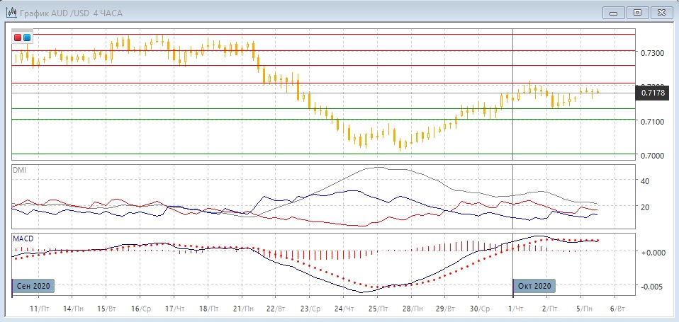 На четырёхчасовом графике ниже 0,7200 образуются свечи "дожи", это скорее медвежий признак, так как импульса для преодоления важного уровня сопротивления не видно. Уровень 0,7200 укрепляет и то, что в этом масштабе может образоваться медвежье расхождение максимумов пары и гистограммы MACD. Если предполагать движение в диапазоне 0,7130-0,7200, более вероятным видится снижение к нижней границе. По индикаторам направленного движения тенденция слабо выражена: превышение DM+ над DM- небольшое, гистограмма MACD около нулевого уровня, линия MACD горизонтальна.
