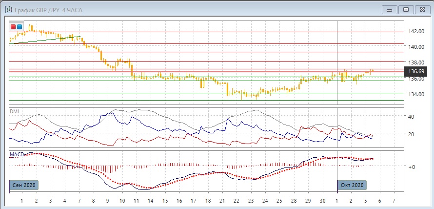 На четырёхчасовом графике пара стабилизировалась у диапазоне 135,50-137,00. В рамках диапазона предпочтительно снижение, так как пара уже находится на верхней границе. По индикаторам направленного движения тенденция флэт: DM+ и DM- пересекаются, гистограмма MACD колеблется около нуля, линия MACD примерно горизонтальна. Импульса для преодоления уровня 137,00 сейчас не видно. Однако в более широкой перспективе выход из диапазоне сейчас более вероятен вверх.
