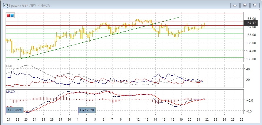 На четырёхчасовом графике пара находится около верхней границы предполагаемого диапазона 137,55, сопротивление на этом уровне может быть сильным. По индикаторам направленного движения в этом масштабе также флэт: ADX на низком уровне, DM+ и DM- близки, гистограмма MACD около нуля, хотя линия MACD сохраняет положительный наклон. Преодоление сопротивление на 137,00 может быть бычьим признаком, но пока пара ниже 137,55, вероятность разворота вниз кажется высокой.