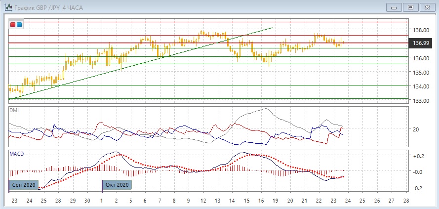 На четырёхчасовом графике пара снизилась от верхней границы диапазона 137,55, сопротивление на этом уровне укрепилось. Исходя из движения в диапазоне, более вероятно снижение к 135,50, однако в данный момент пара получила поддержку на 135,65, как и 19-21 октября. В более широкой перспективе снижение облегчает образование ранее медвежьего расхождения максимумов пары и гистограммы MACD.