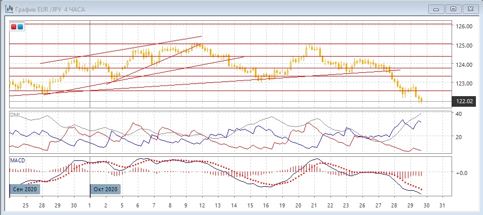 На четырёхчасовом графике снижение замедляется и может произойти отскок. Образовалось медвежье расхождение минимумов пары и гистограммы MACD. Нижние тени свечей также указывают на поддержку. Отскок, вероятно, будет коррекционным, так как снижение сильное. Особенно это видно по ADX: превышение DM- над DM+ очень большое при высоком уровне ADX. Сопротивление может быть на 122,55, уровне поддержки на минимумах конца сентября. В целом, даже если отскок и произойдёт, продолжение снижения кажется предпочтительным.