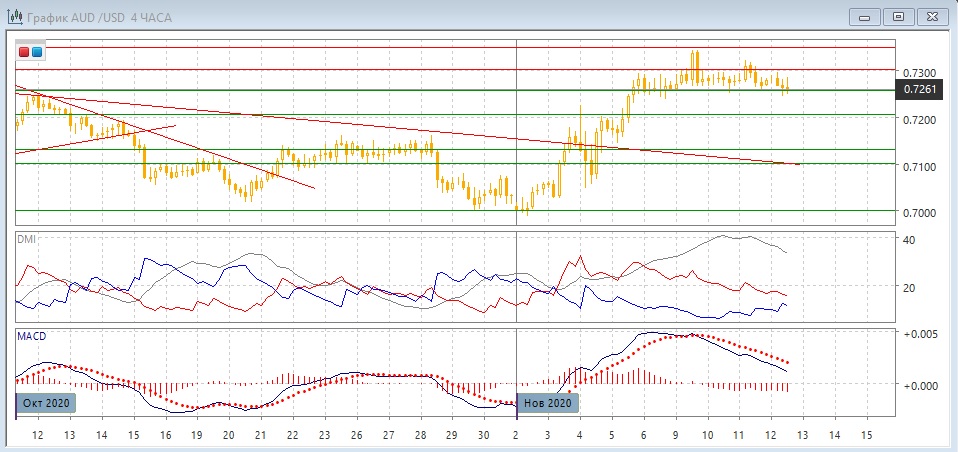 На четырёхчасовом графике пара остаётся в узкой консолидации 0,7260-0,7300. 11 ноября был ещё один краткосрочный пробой вверх, после чего пара достигла нижней границы. Исходя из движения в диапазоне, более вероятно достижение верхней границы на 0,7300. Дальнейшее более значительно движение скорее будет в сторону выхода пары из канала.