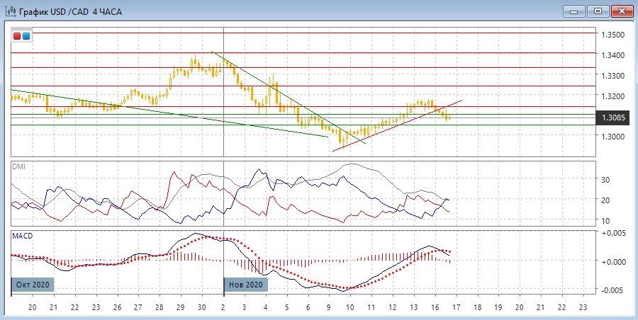 На четырёхчасовом графике пере преодолела краткосрочную линию тренда, если строить её с 9 ноября. Близость сильных уровней поддержки может приостановить движение, так как пара уже около минимумов 1,3050, а далее психологически важный уровень 1,3000. Риск отскока вверх от этих уровней велик. Более краткосрочно, снижение пары ниже важной в этом масштабе поддержки на 1,3100 предполагает, что в ближайшей перспективе пара скорее будет снижаться.