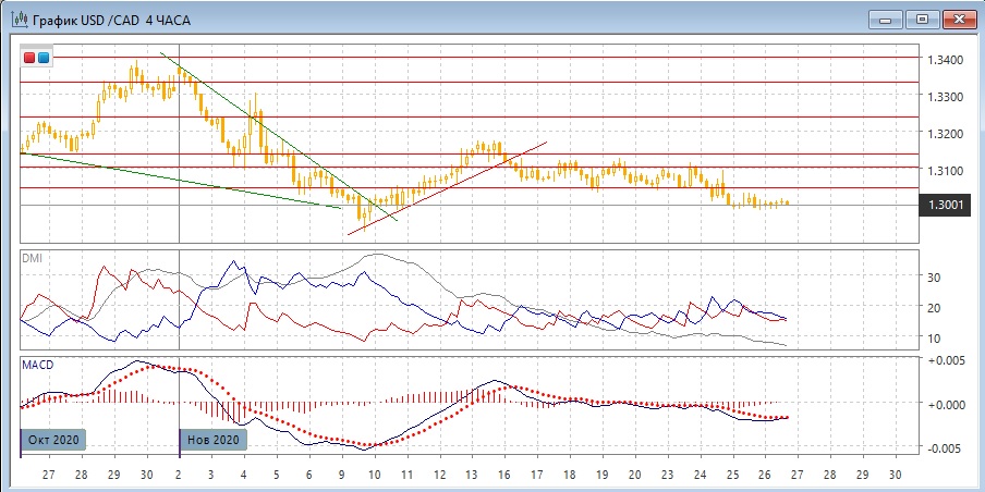 На четырёхчасовом графике происходит консолидация в около 1,3000. Образовался ряд свечей "дожи", и в четверг-пятницу, из-за малоактивного рынка в США, пара может оставаться около этого уровня, так как пока не видно, что могло бы стать в эти дни новостным толчком для преодоления уровня 1,3000 (или, наоборот, отскока от него вверх).