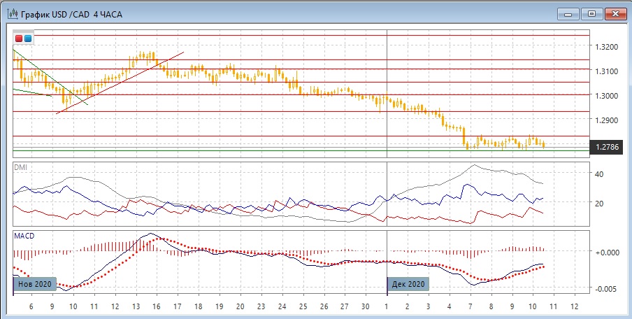 На четырёхчасовом графике пара находится в консолидации 1,2770-1,2830, после снижения от верхней границы пара близка к нижней. Дальнейшее более значительное движение, скорее, будет в сторону выхода пары из консолидации. Пока более вероятным видится продолжение снижения, так как это было направлением до консолидации. По ADX в этом масштабе тенденция снижения остаётся хорошо выраженной: превышение DM- над DM+ относительно большое и устойчивое, ADX на высоком уровне.